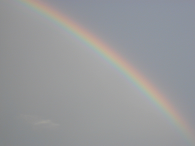 途中の橋を渡るとき、ふと横を見ると大きな虹がかかっている。本当に大きな虹。生の虹なんて何年も見た記憶がないのでちょっとうれしい。道行く人々も虹を長めながら歩いていく。立ち止まって見ている人もいる。